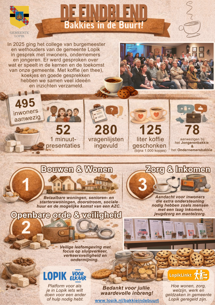 Burgemeester Renate Westerlaken en wethouders Gerrit Spelt en Jan Vente gaan graag weer met u in gesprek onder het genot van een 'bakkie in uw buurt'. Hieronder vindt u een overzicht van de komende 'bakkies'.