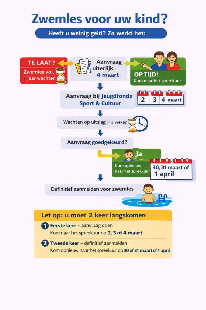 3) Om uw kind echt aan te melden voor zwemles, moet u nog een keer langskomen op één van deze spreekuren. Dit leggen we uit tijdens de eerste spreekuren.