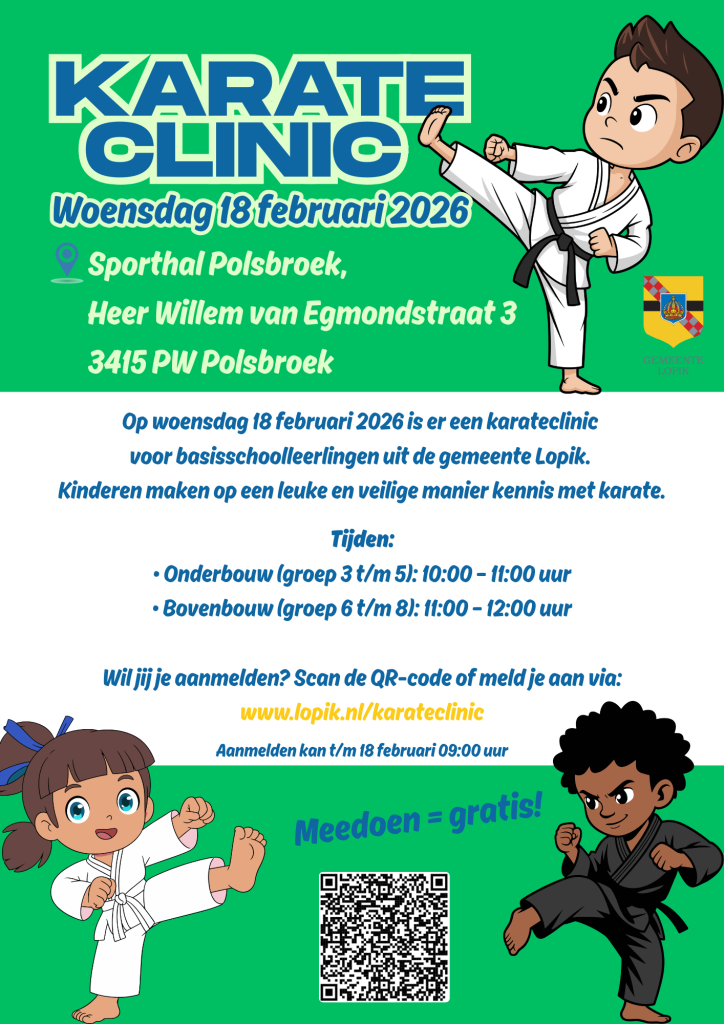 Op woensdag 18 februari 2026 is er een karateclinic voor basisschoolleerlingen uit de gemeente Lopik. Kinderen maken op een leuke en veilige manier kennis met karate.