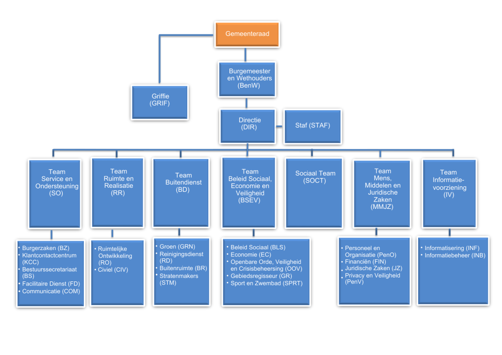 De organisatiestructuur bestaat vanaf 01-09-2025 uit een tweekoppige directie en 8 teams. Ieder team wordt aangestuurd door een teamleider (met uitzondering van het team: staf, deze wordt aangestuurd door gemeentesecretaris/algemeen directeur). De teamleiders en tweekoppige directie vormen samen het managementteam.